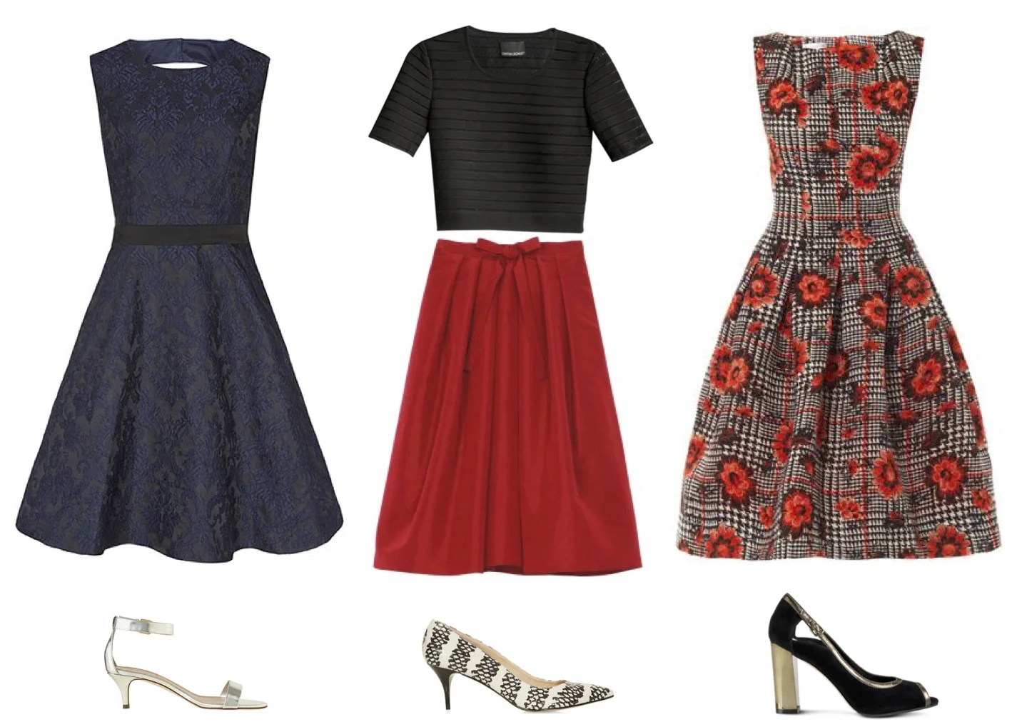 Blue Fit and Flare Dress by Reiss, $283 | Metallic Kitten-heel Sandals by J. Crew, $188 | Crop Top by Cynthia Rowley, $250 | Silk Faille Full Skirt by Tibi, $525 | Kitten Heels by Topshop, $116 | Houndstooth and Flower Silk-jacquard Dress by Oscar de la Renta, $2448 | Suede and Metallic Open Toe Pumps by Cole Haan, $199.95