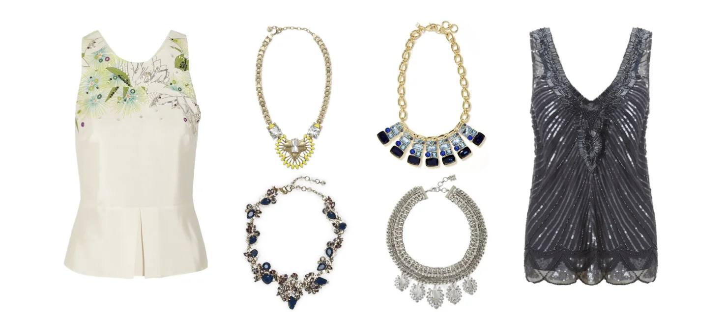 Embellished Silk Top by 3.1 Phillip Lim, $247.50 | Norah Pendant by Stella & Dot, $98 | Navy Necklace by Erickson Beamon, from Club Monaco, $295 | Blue Crush Statement Necklace by Banana Republic, $79.50 | Woven Chain Statement Necklace by BCBG, $168 | Grey Beaded Flapper Top by Jigsaw, $173