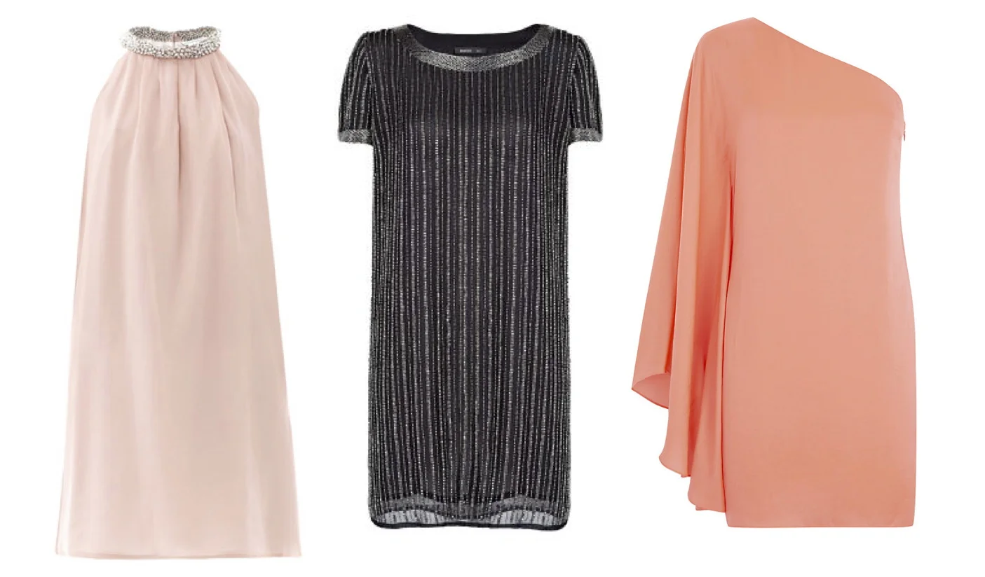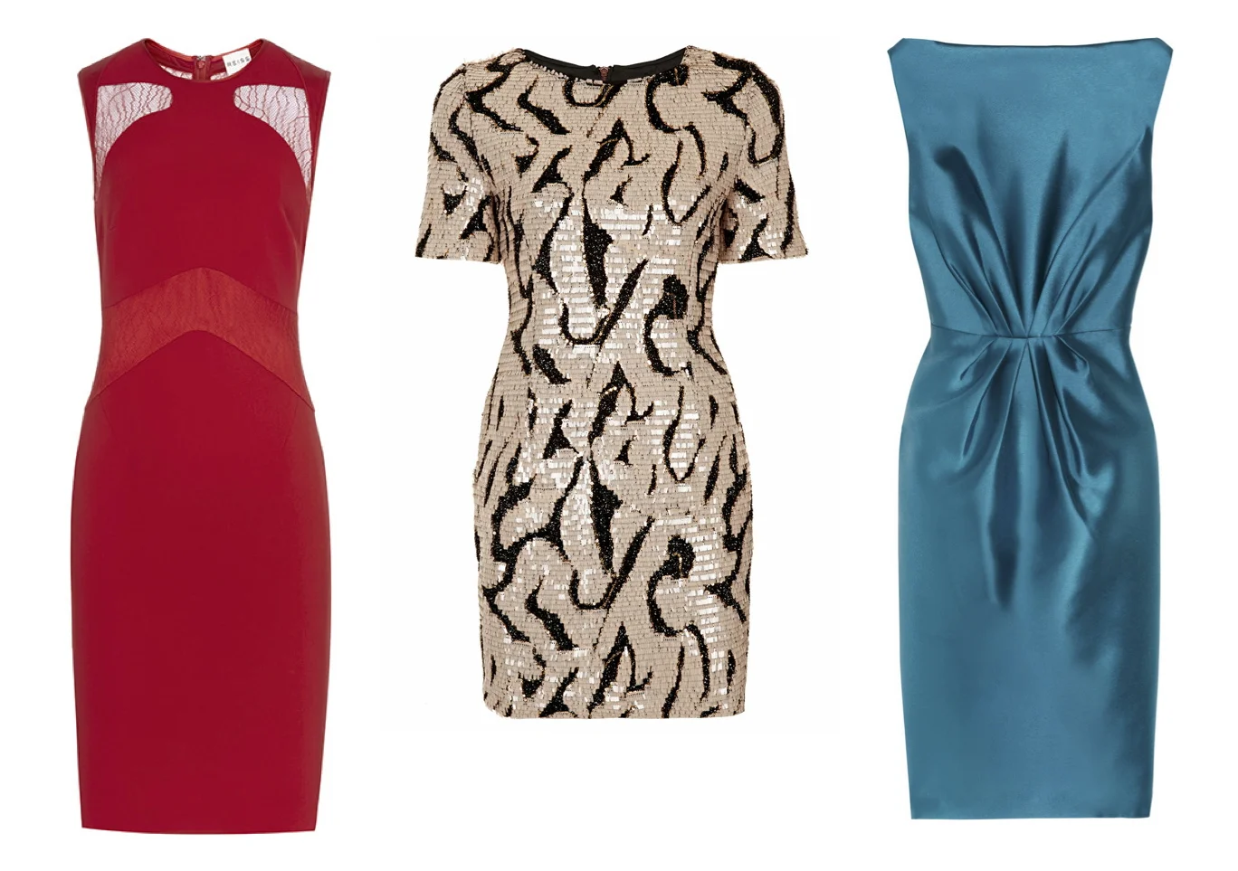 Lace Panel Dress by Reiss, $300 | Sequin Tinsel T-shirt Dress by Topshop, $140 | Gathered Satin Dress by Badgley Mischka, $242.50