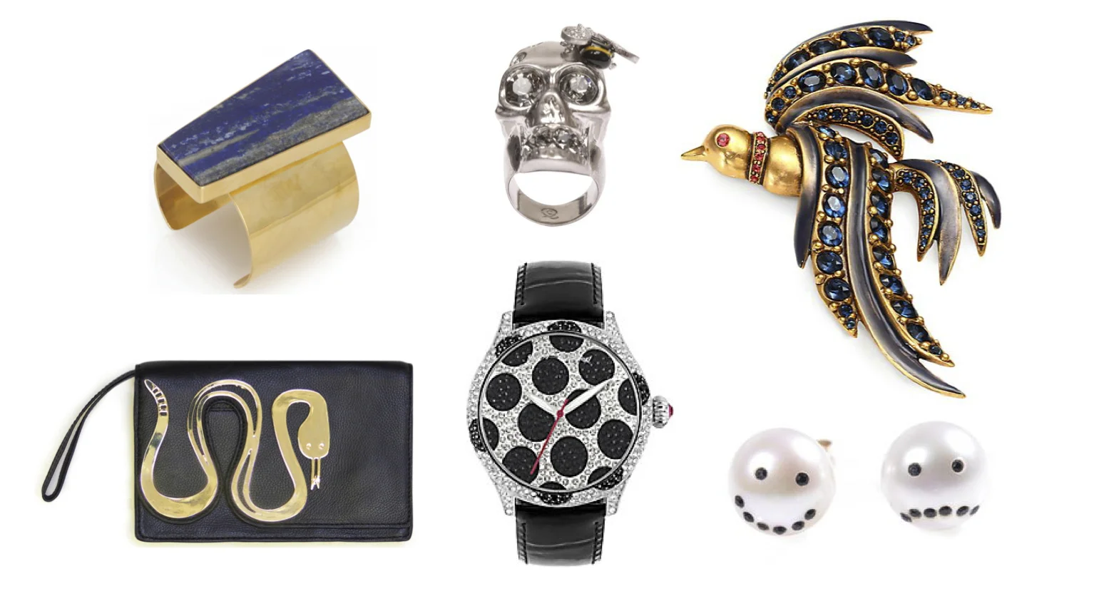 (clockwise from top left) Lapis Facet Cuff by Kelly Wearstler, $395 | Crystal Bee and Skull Cocktail Ring by Alexander McQueen, $290 | Crystal Bird of Paradise Brooch by Oscar de la Renta, $295 | Crystal and Pearl Earrings by Nektar de Stagni, $427 | Crystal Polka Dot Watch by Betsey Johnson, $185 | Vera Clutch by Jonathan Adler, $198
