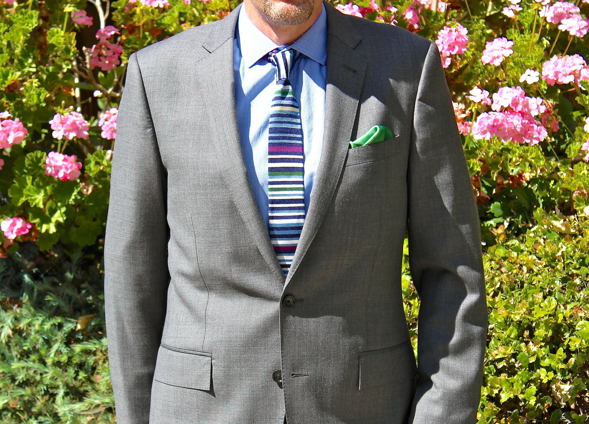 Summer is the perfect season to try new colors - the brighter the better! A horizontal multicolor striped tie really amps up this outfit, and provides the roadmap for other accessories - a green colorblock pocket square (see my purple one here), dot socks, and fuchsia shoelaces.