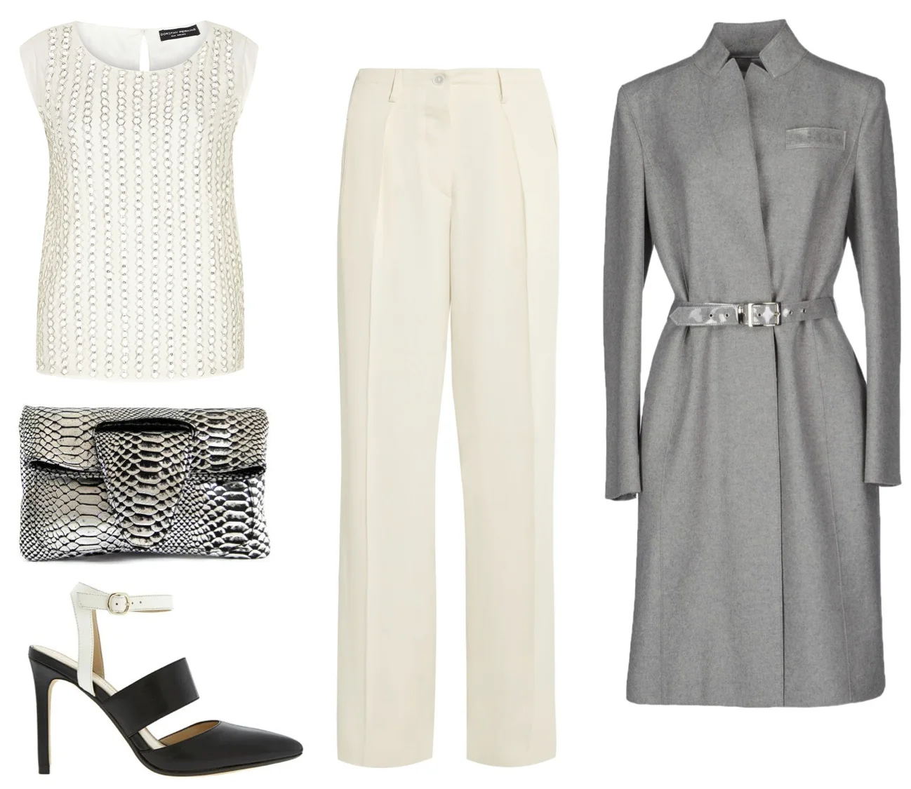 Ivory wide leg pants and a shiny top – seasonless and always stylish. Use a grey wool coat to tone down the full on white-on-white look, and add some black and white accessories for a graphic punch. Then grab a silver cuff and head out the door.