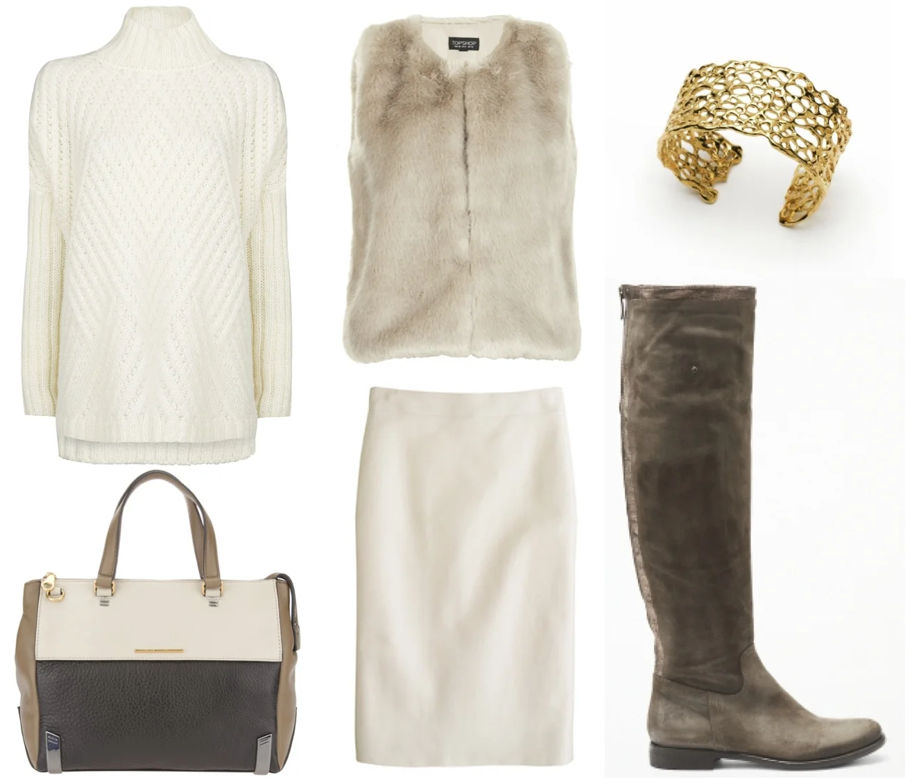 Yes, you can dress appropriately for work and be winter cozy at the same time. An ivory chunky turtleneck looks fab with skinny jeans, but becomes office-friendly with a matching pencil skirt. Add a fur vest, taupe knee-high boots, and a gold cuff – and tie it all together with a neutral color block bag.