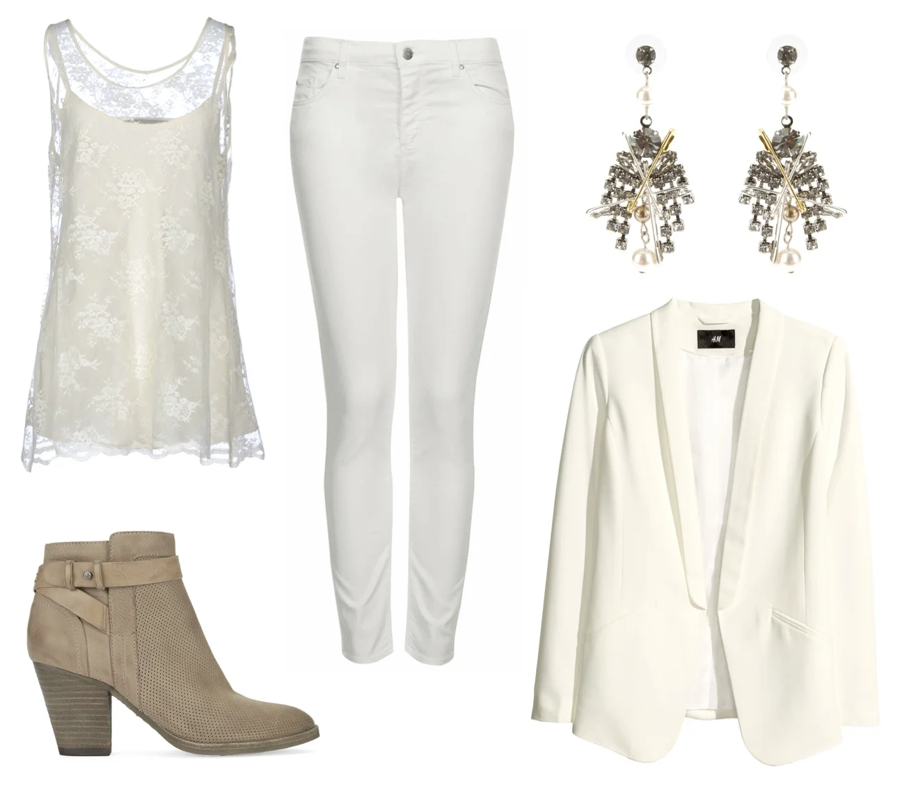 You’ll be totally cool (and totally hot) in white skinnies, a boyfriend tux blazer, and floaty lace top. Ground your look with chunky camel booties, and add some edgy-girlishness with delicate sculptural earrings.