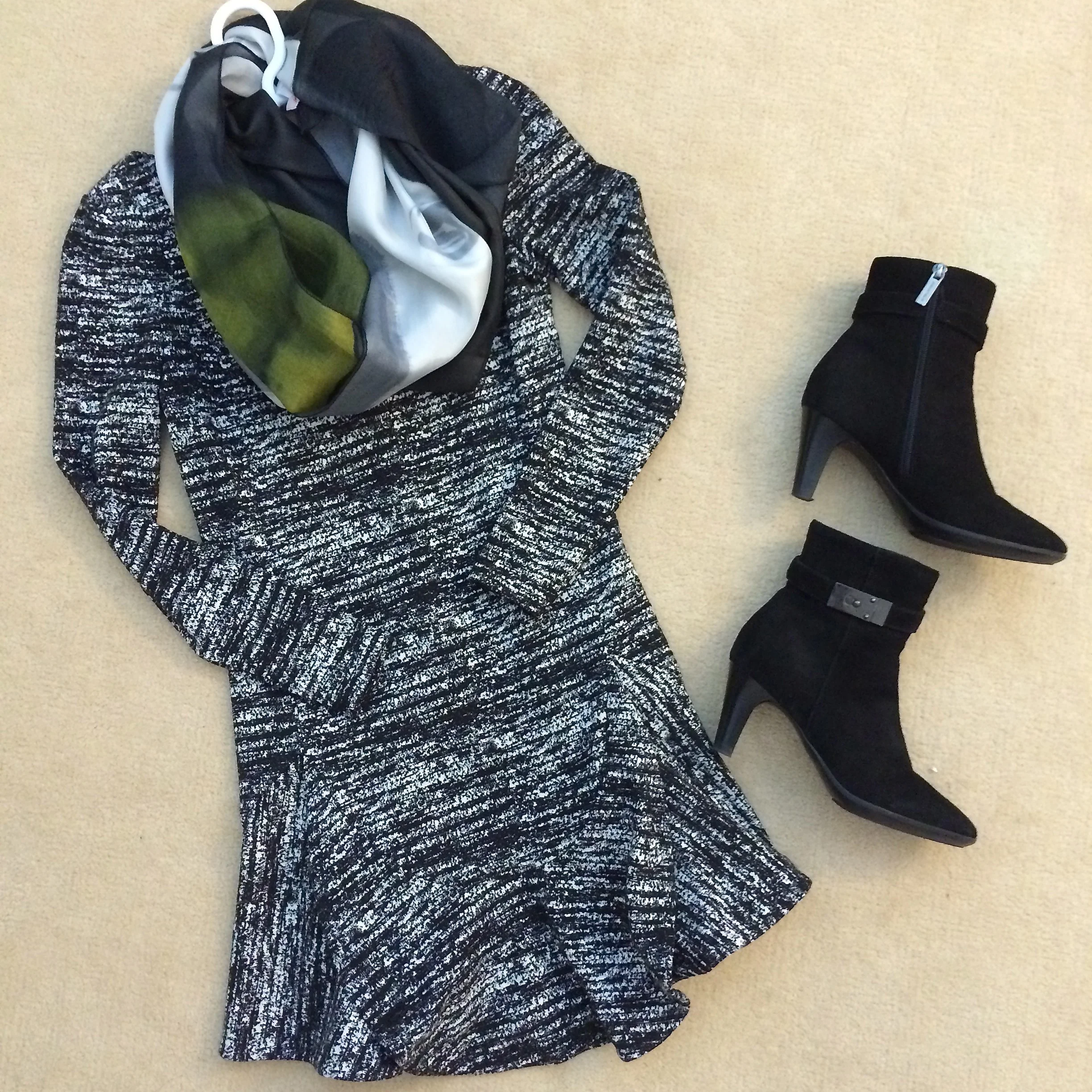 Another Ellen Brook scarf adds a graphic focus, and a little pattern play to this look. How does the second print work? It's based in the same colors as the dress, but in a different scale.