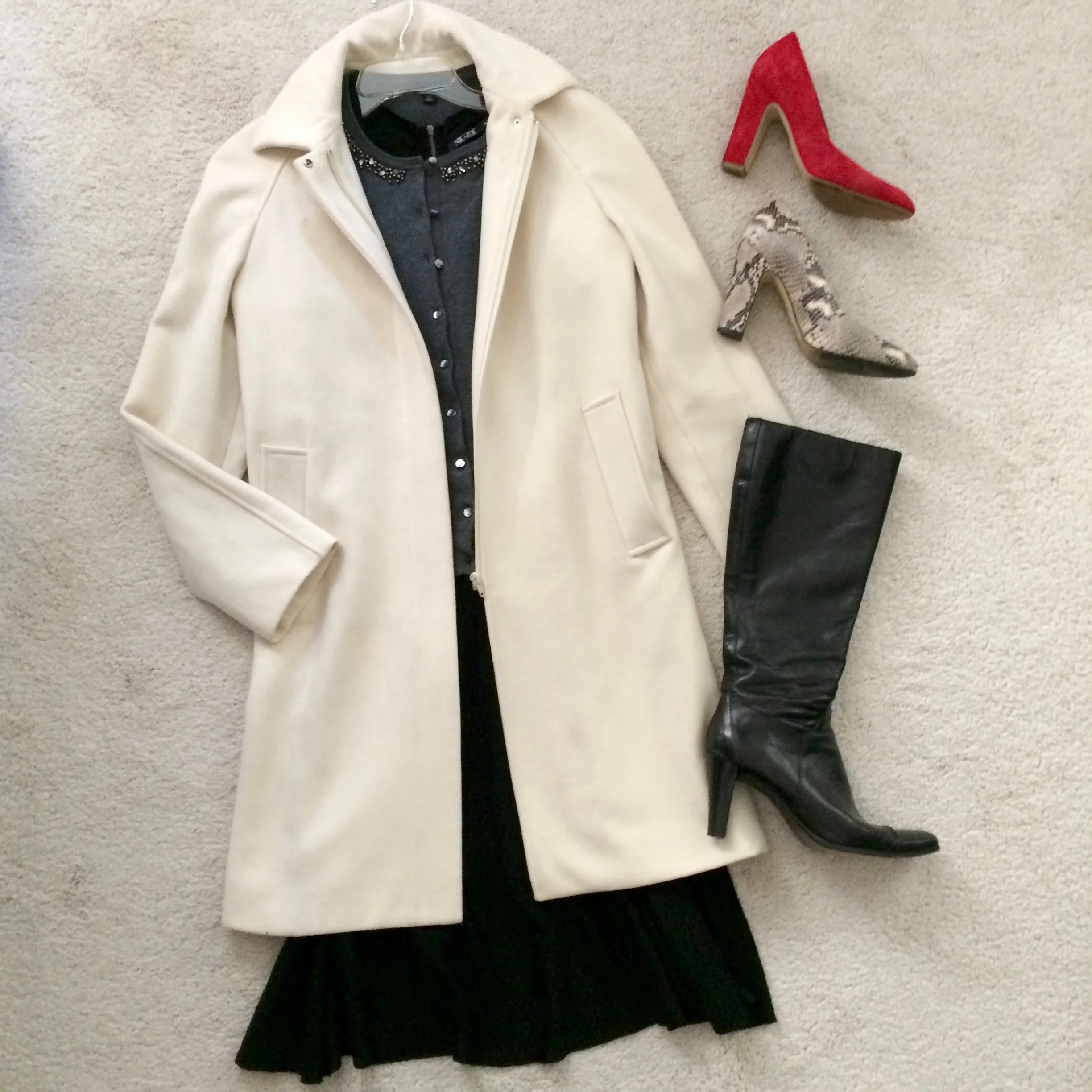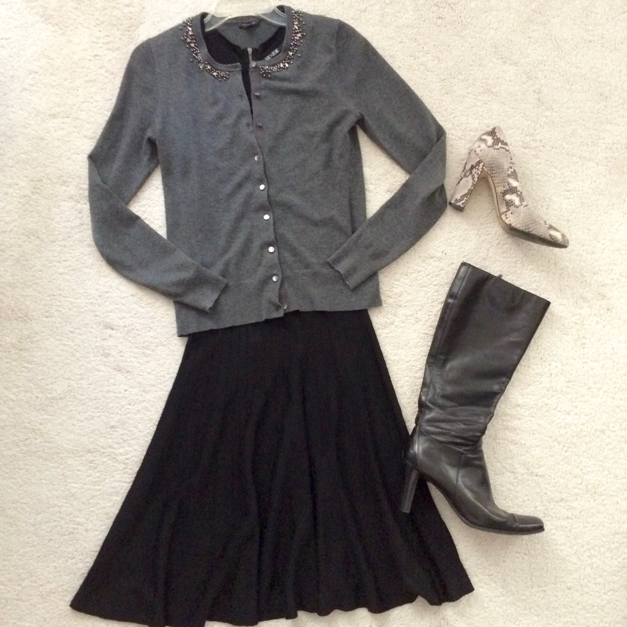 The same outfit principles apply to a black fit and flare sweater dress - I added her charcoal cashmere cardigan (with a beaded neckline for a hit of shine) and ivory wool coat for a look she can wear from desk to dinner with a quick change of shoes.