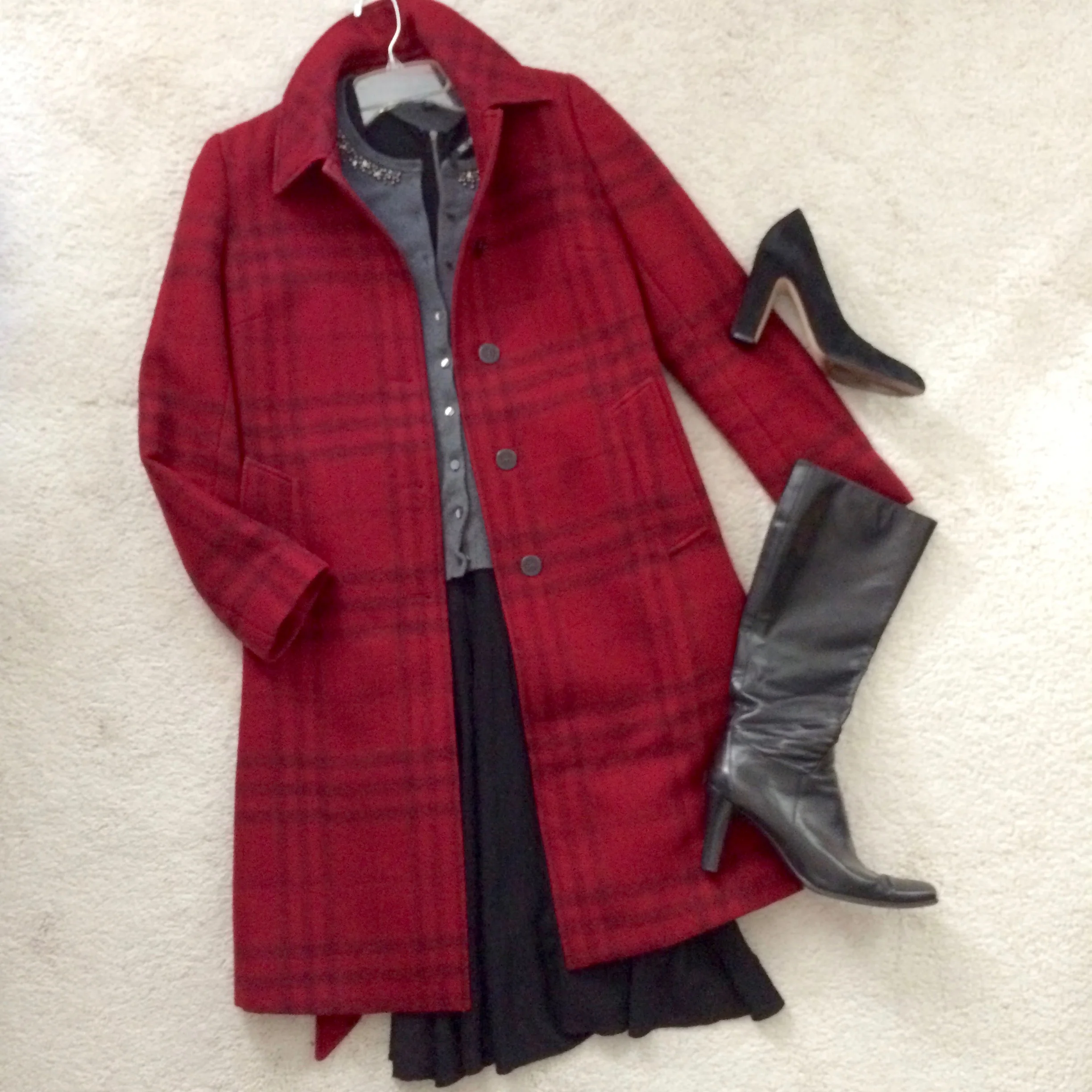 Transitioning her dress to moderate fall weather (or a temperate January) is relatively straightforward - I grabbed her chunky grey cardigan and black boots. And for a cool morning - a plaid scarf in tones similar to the dress is perfect!