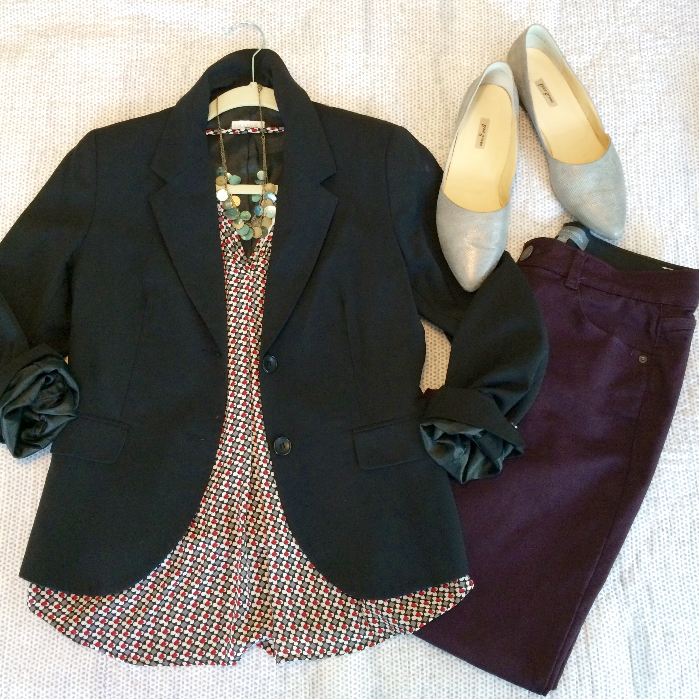 The grey blazer, black blazer and print tops were already in Amy's closet before we started working together - so my job was showing her appropriate ways to wear them for her new position.