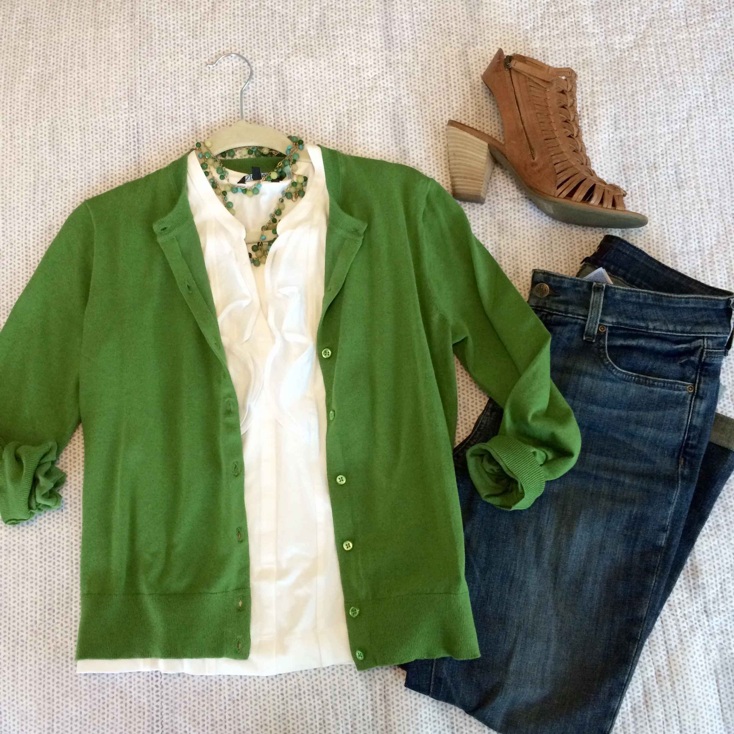 I love how the cardigan plays off the shades of green in Amy's necklace - and the great thing (since the rest of the outfit is neutral) is that this could be any color cardigan that mimics the hues in any piece of jewelry.