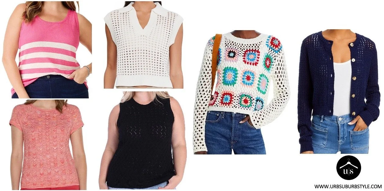 The good news is that you can find lightweight cottons, linen and silk blends that feel totally summer right. And (not to keep talking about trends) crochet and open weave textures are a big trend this season. Which means that you can find long-sleeve, open knit sweaters – so you get coverage with built-in breathability.