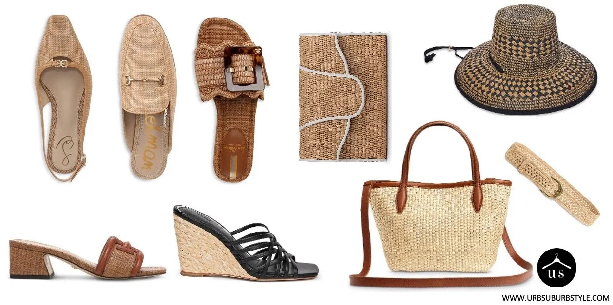 Since raffia is on trend, you’ll find it in a bunch of incarnations. A raffia tote is an ideal poolside and farmer’s market companion – and then switch to a raffia clutch for date night. Raffia sandals, flats and slides are an easy way to shift the same t-shirt and jeans (that you’ve been wearing all spring long) into a summery vibe. Raffia heels and wedges are a no-brainer with most any sundress. And you can always grab a raffia hat or belt to add a little summer flair.