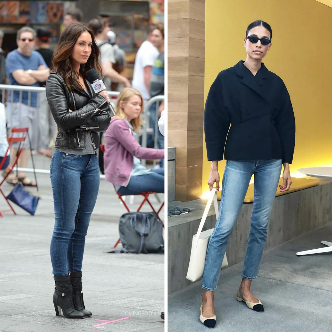 The outfit on the left feels ‘dated’ because of the skintight jeans & figure hugging jacket (image from Pinterest, no source credited). While on the right, it feels more updated with a looser jacket & jeans that don’t fit like denim tights (image from WhoWhatWearUK)